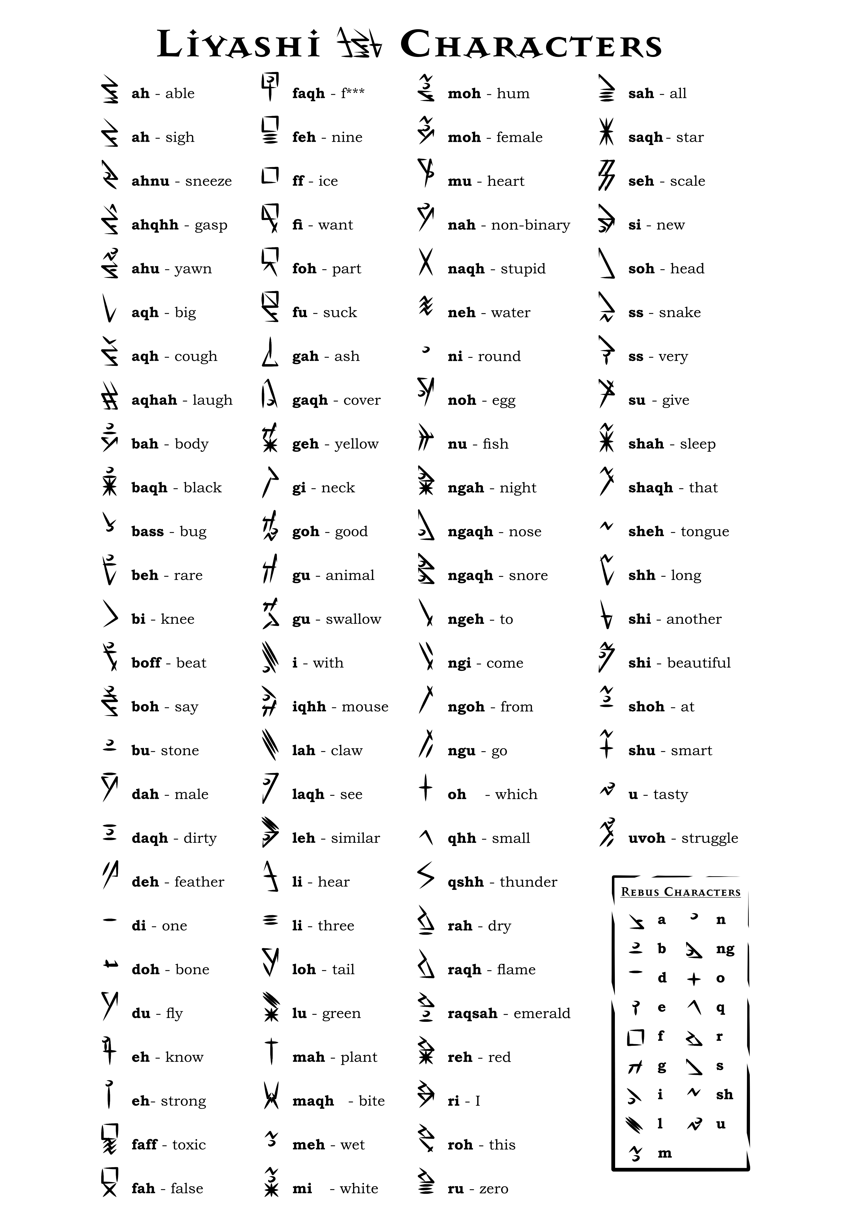 I created Liyashi for Dragon Royale by Gnarly Games in July 2020, and in-world it’s spoken by dragons. This was a custom package made to include a small logography, and its price was between the ‘standard’ and ‘in-depth’ package.