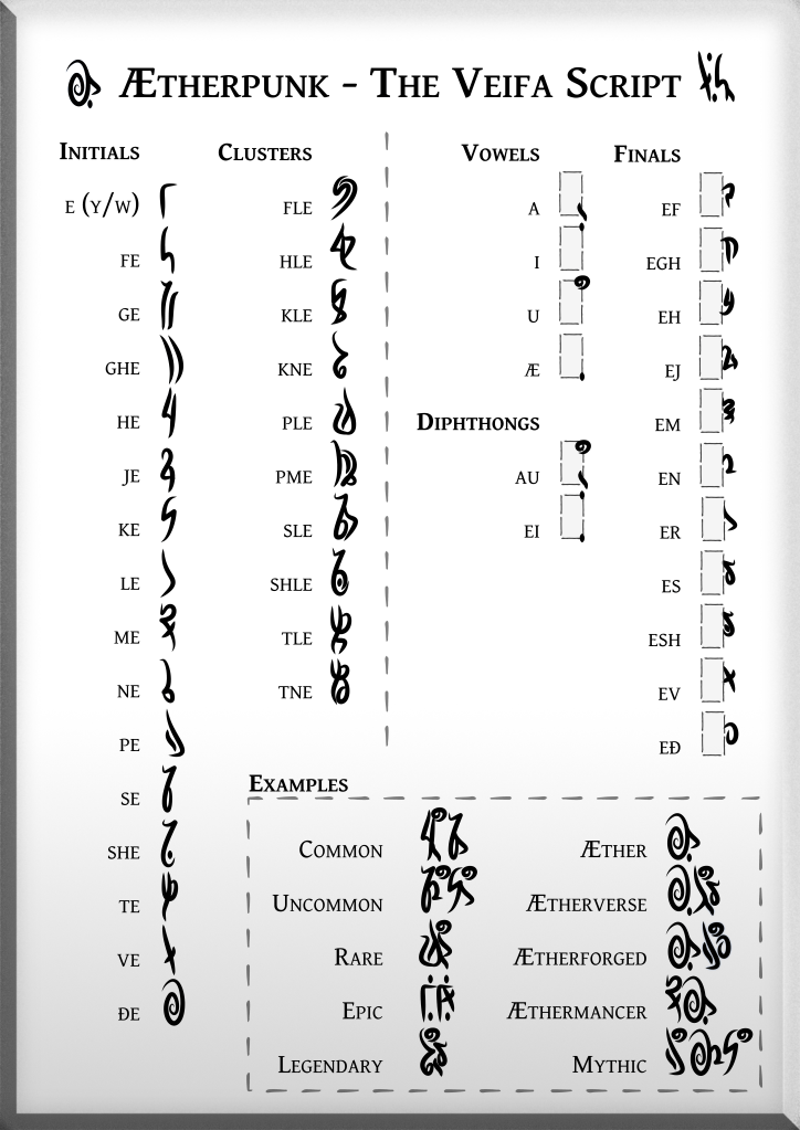 I created the Veifa script for Aetherpunk in March 2021. It’s primarily a written language used to enchant weapons and armour. This is the basic ‘Naming Language’ package, so doesn’t include any grammar.